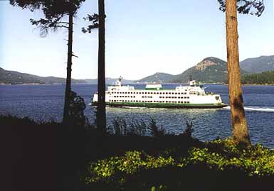 Rosario Resort visible in distance up Eastsound over ferry's smokestack. Photo taken from deck of house.